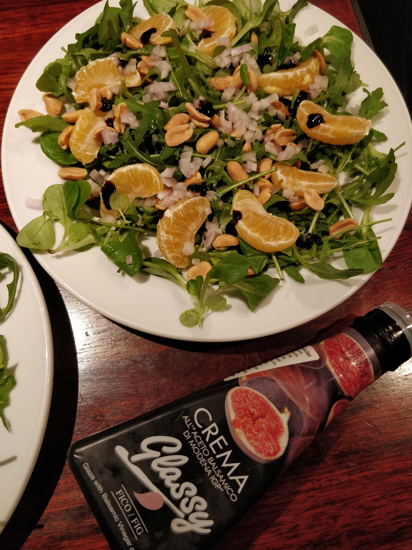 Det minder nok mest om sådan en spansk eller italiensk forret. Med Serranoskinke, rucola og olivenolie. Men jeg synes, jeg har ført det til et nyt niveau. Måske ikke helt i ånd med det meget enkle, italienske køkken. Tilgengæld kan det nu serveres som en frisk sommer forret såvel som hovedret, fordi jeg har tilføjet en masse ekstra ingredienser! Der er stadig en genial balance imellem sprødt, sødt, salt osv. Det er super nemt at lave, og så mætter det på en dejlig let måde. 😀