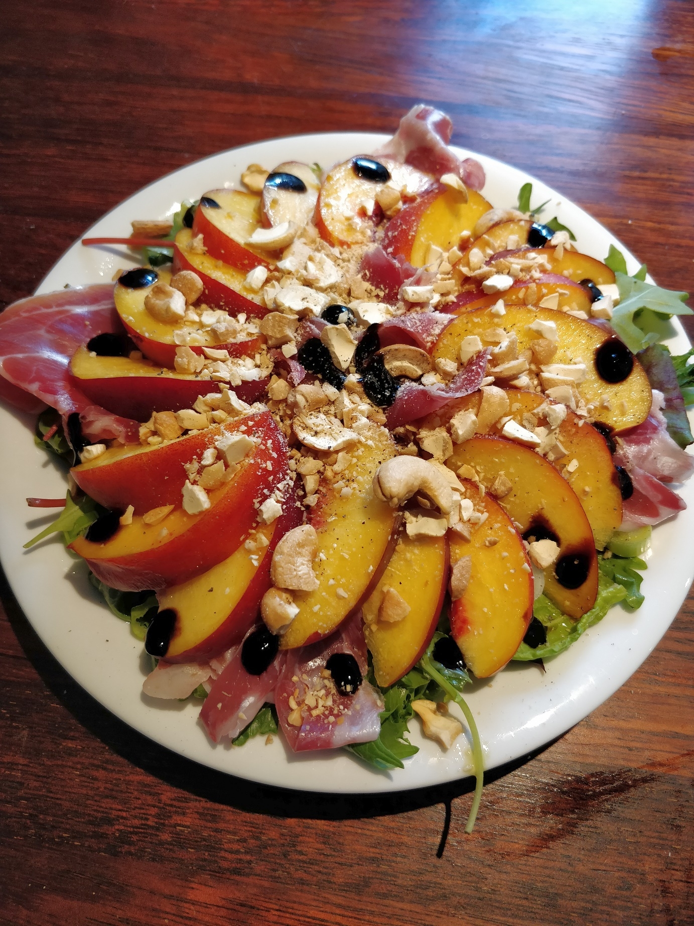 Forstil jer sprød salat, med søde, modne nektarin både, tynde skriver lufttørret skinke og salte nødder…