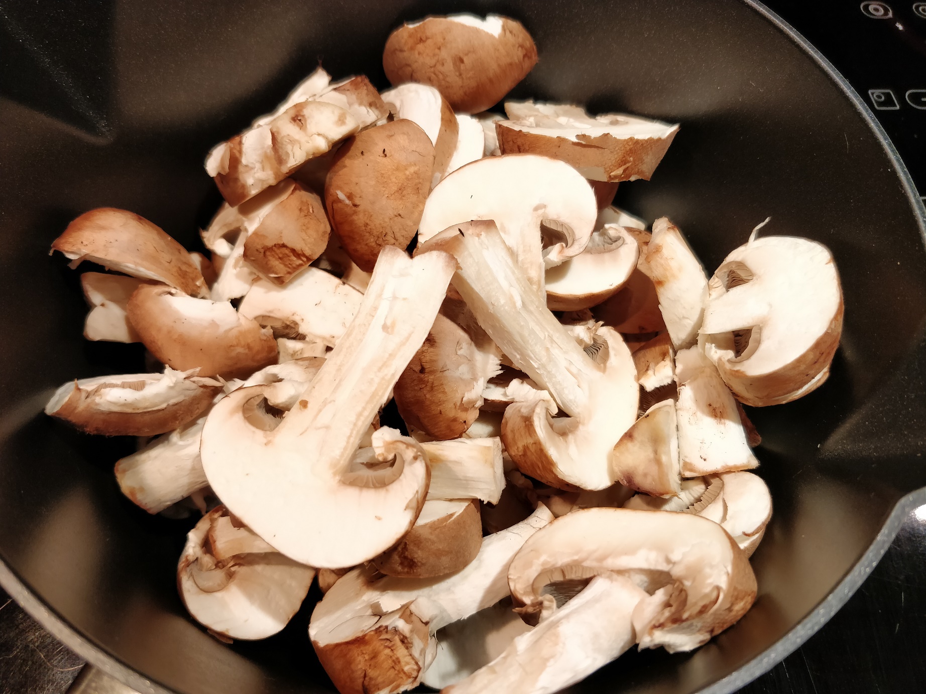 Det behøver ikke, som her, at være brune champignoner. Hvide champignoner er også fine. Faktisk kan opskriften også laves med andre svampe, f.eks kantareller eller østershatte, eller måske en blanding. Det gør det jo bare endnu mere luksuriøst. 😉