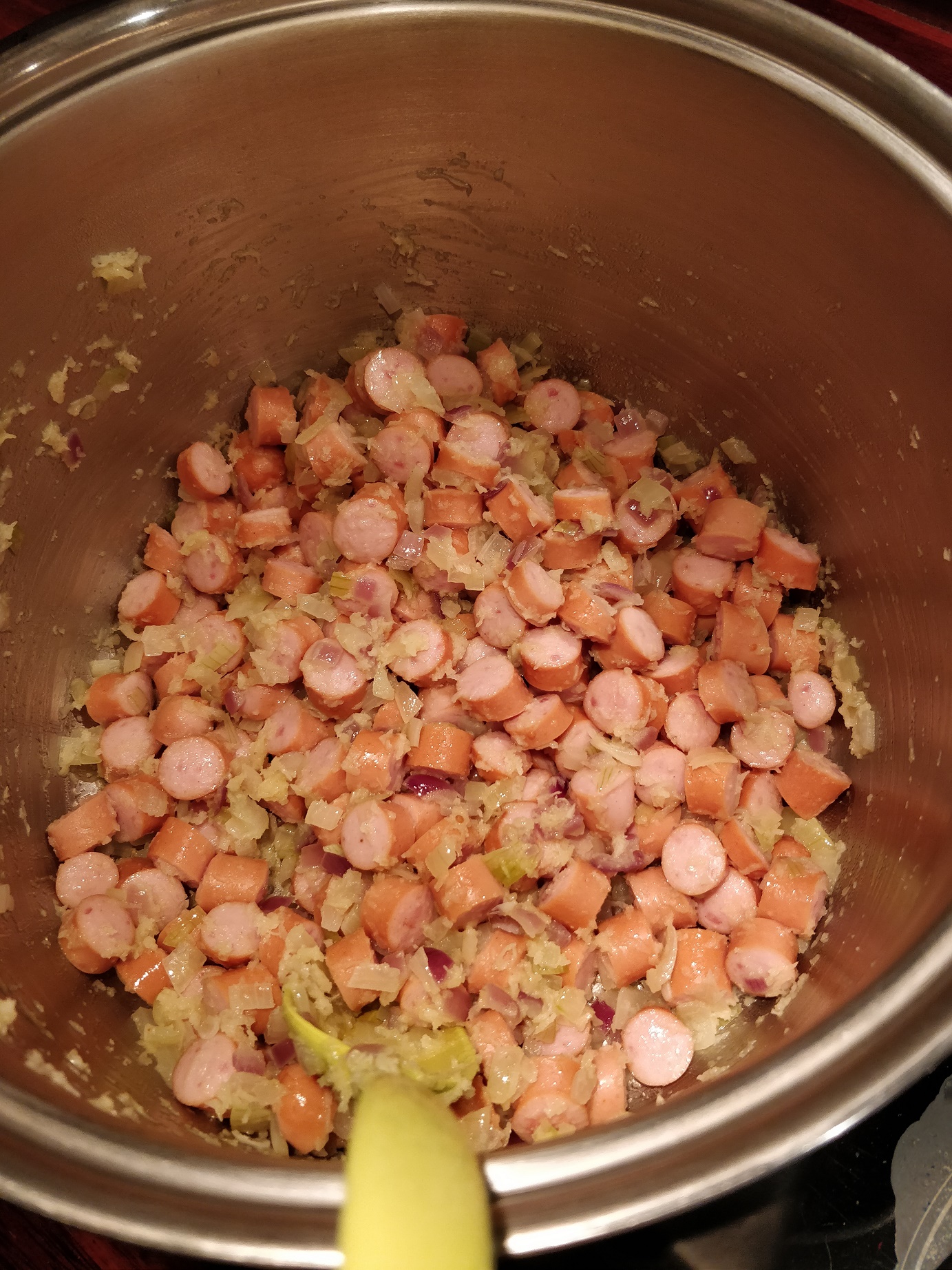 Vi havde fået en stor pakke pølser, som skulle have været smidt ud, efter et arrangement, nogen i familien, havde været til. Det havde jo været synd, men på den anden side, hvad bruger to mennesker lige en kæmpe pakke pølser til? Man kunne jo have frosset dem, og tøet dem op i portioner, men nej. Man laver da svensk pølseret, så man har til fire dage… Det er faktisk meget rart, for med baby i huset, er det jo ikke nødvendigvis madlavningen, der er mest tid til i hverdagen. 🙂