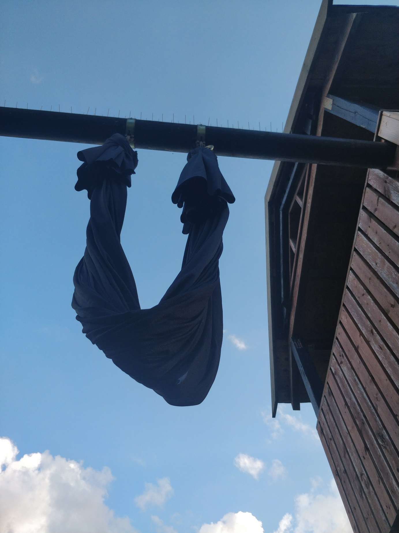 Så det jeg betragter som de billige modeller yoga seler, som denne koster omkring 600kr. 1000 for en yoga hængekøje, som består af omkring 6 meter stof, der er så bredt, at man kan ligge udstrakt i det. Det jeg skal til at vise hvordan jeg har lavet, er ikke en hængekøje. Det er en yoga sele. Og derved kan man altså ikke lave alle de samme øvelser, som i en yoga hængekøje, men mange af dem kan man godt. Så er man i tvivl, om man helt ønsker at bruge 600-1000kr på en yoga hængekøje eller sele, og er man bare en smule kreativt anlagt, kan man jo blive inspireret her først. 😉