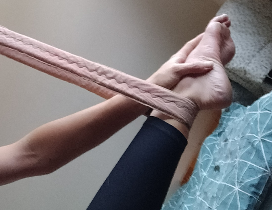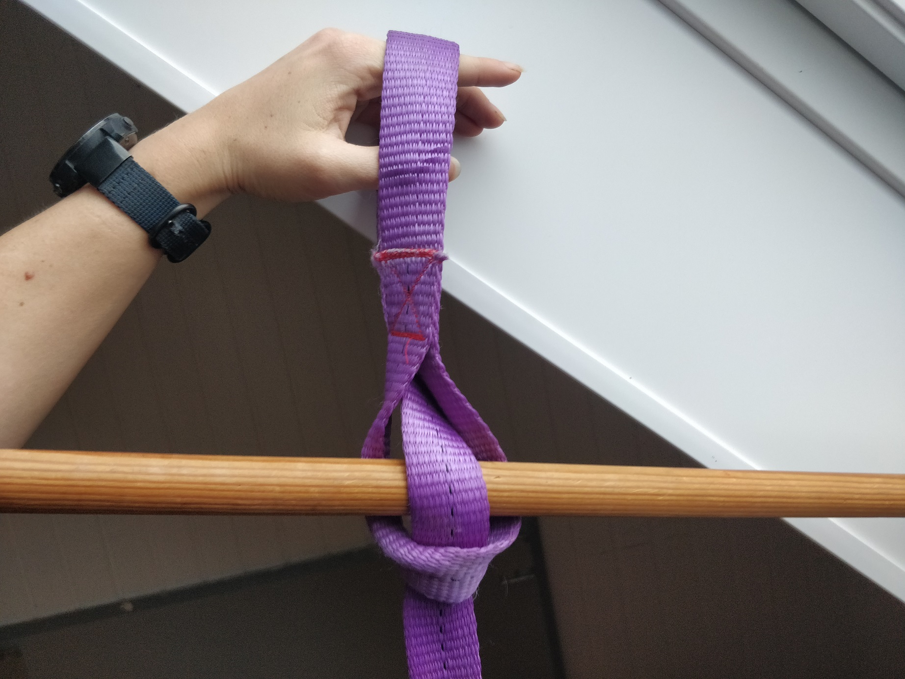 Måden jeg har syet min yoga sele på, er inspireret af andre yoga seler, hvor man kan justerer længen lidt på selve selen, ved at flytte, i det her tilfælde min rundstok af træ, længere op eller ned. Man kan sagtens bruge to mindre stykker rundstok i stedet for et langt, men man har altså ikke behov for ringe og karabiner!