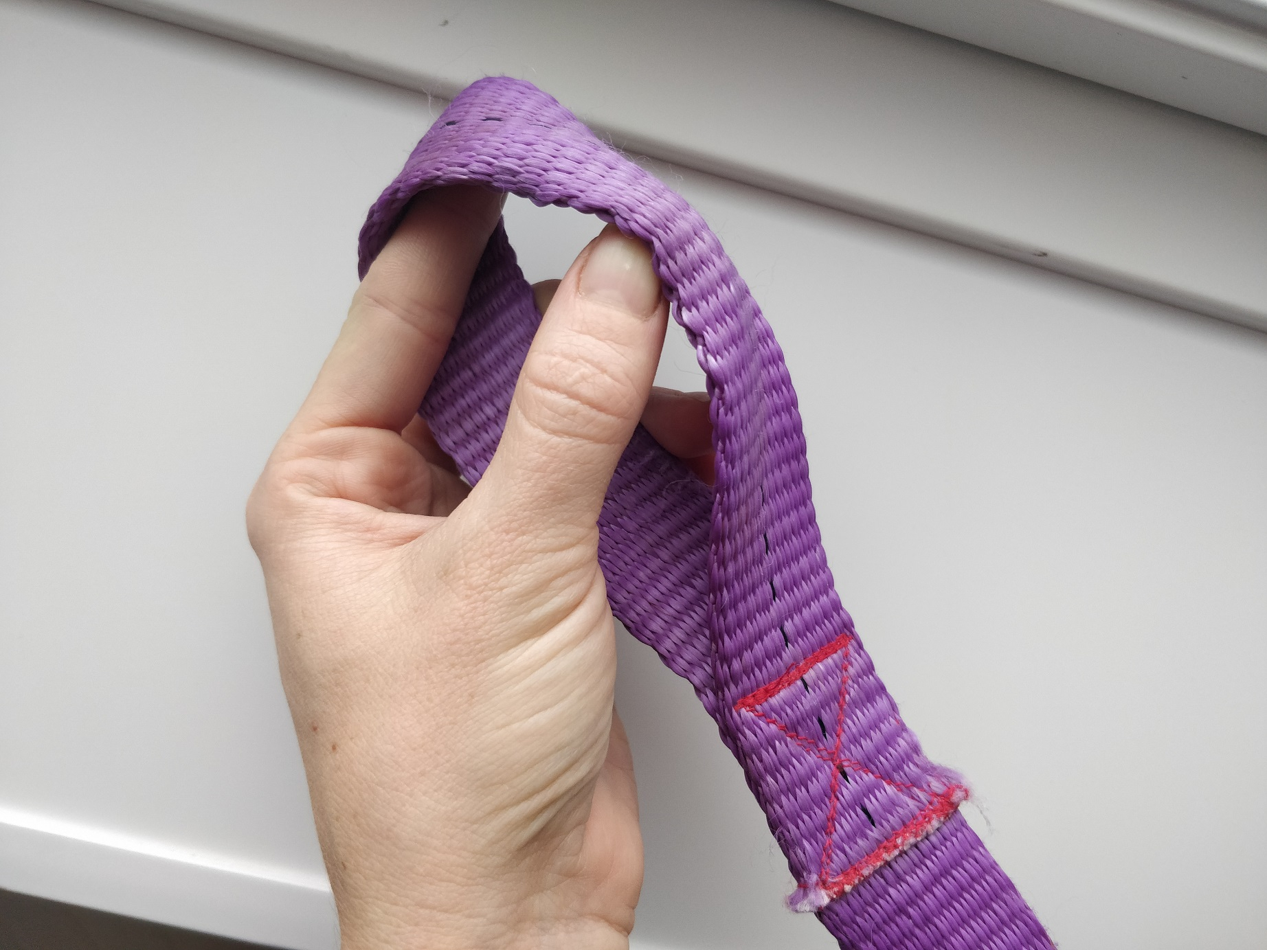 Jeg startede med at klippe min surrings strop, så den passede i længden. Plus lidt ekstra til ophæng og til at sy løkker af. Der skal nemlig sys en løkke i hver ende. Den skal selvfølgelig syes grundigt. Jeg har syet flere gange oven på hinanden i en firkant og et kryds, for at være helt sikker på at det holder. Jeg endte med at klippe min strop ca 4m og 20cm lang. Så det er måske et ca. mål man kan gå efter, når man leder efter bånd, men mål lige selv efter hvor lang den skal være, der hvor den skal hænge.